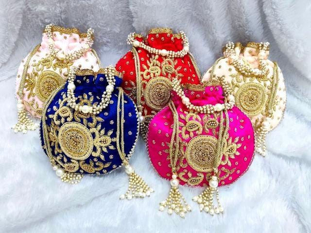 Indian Beautiful Embroidery Peacock Wing Potli Bag With Pearl Handle, This Is Beautiful Embroidered Potli Bag ,This Is Beautiful Peacock Wing Work Potli Bag , This Is Beautiful Round Shape Embroidery Work Potli Bag The Awesome Blend Cotton Slik Fabric, All Side Beautiful Work And Beads Work On Potli Bag , It Features Intricate Embroidery, Open and Closed With The Help Of Ropes, The Handel Material Golden & White Beads, Both Side Beautiful Beads Latkan Provide For Extra Look , and Rich Color Makes For a Stunning Potli Bag a Ethnic Stylish Potli Bag , kind of Indian Bridal Handbag, Looks Very Nice With Any Traditional Dresses, You Can Easily Carry Big Mobile Phones, Valuable Items, Cosmetics etc as Handbag,is Having Spacious Compartment. Also Goes Well With Any Casual Indian Dresses. This Purse For Girls and Woman For Multiple Events and Occasion Such as Festivals, Navratri, Bridal, Ehtnic, Ethnic Party, Western Casual & Party, Diwali, Dandiya, Mehandi, Haldi, Sangeet, Engagement, Wedding, Reception, Baby Shower, Party or Fashion Shows,Best Option For Gifting as Mehendi Favors , Wedding Favors , Wedding Return Gift , Birthday Return Gift, Kitty Party Gift. Ladies Will love it. Ideal For Parties, Weddings, Traditional Events, For Packing Dry Fruits , Sweets , Chocolates , Jewellery etc to Gift On Different Occasions Like Weddings , Birthday and Festivals.